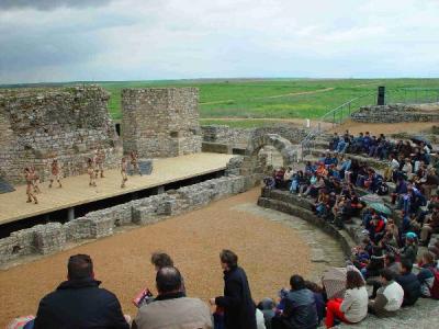La realización más significada del lugar, y por el que Casas de Reina resulta conocido en el dominio histórico-artístico, es el Teatro Romano de Regina, la antigua fundación imperial situada en sus cercanías (a menos de 1,5 km.).Este Teatro fue proyectado para tan sólo unas 800 personas, cifra que nos da una idea de la categoría y dimensiones de la ciudad. Se conservan casi perfectamente elementos como la cavea, orchestra y la scena. La obra, aflorada junto con otros restos de la ciudad en el transcurso de las excavaciones realizadas en los últimos años, constituye, con las de Mérida y Medellín, la realización más importante de su clase en Extremadura, y de las más destacadas de toda la Península. Aunque lo descubierto ya es suficiente como para significar el extraordinario valor del enclave, aún se esperan nuevos hallazgos. La fachada, descubierta en el curso de la campaña 1987, con sus contrafuertes está hecha por una poderosa obra de hormigón y mampostería de piedra. El estado actual del graderío nos revela la grandeza anterior, puesto que existió otra grada encima de la existente. Sólo puede verse hoy las filas de gradas de sillería, bien conservadas en las más profundas y divididas en forma de cuñas por medio de escaleras que permitía el fácil acceso de los espectadores.